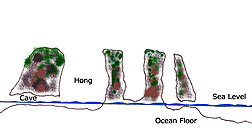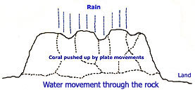 The formation of the lagoons was probably similar in nature to the way the caves were likely formed. When the rock was pushed out of the ground, the depressions would have collected water from rain. This rain water, being pure, could have dissolved minerals in the rock at weak points and formed a basin of water. As the tides worked in combination with the rain water to erode the sediment away, the caves and basins of water lying in the interior of the islands were connected. |